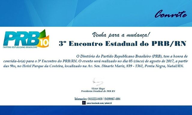 O presidente de honra do partido, Abraão Lincoln, que também é suplente de deputado federal, convida a todos para a convenção. “Será uma honra recebê-los na nossa convenção para discutirmos o futuro do PRB no RN e ouvirmos nossas bases sobre qual será o melhor caminho para o partido em 2018. Contamos com a presença de todos nesse grande encontro partidário”, disse o presidente.