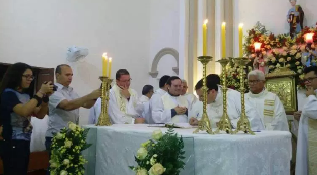 O padre Josino Raimundo, pároco da Paroquia de Nossa Senhora Mãe dos Homens e o padre Fábio Pinheiro, da paróquia dos Mártires em Natal, participaram da celebração de posse do padre Gilvan.