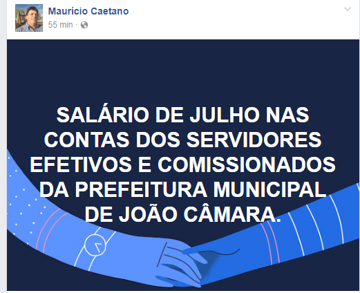 O prefeito de João Câmara/RN, Mauricio Caetano (DEM), informou, na tarde desta sexta-feira (28), em sua página no facebook, que o pagamento da folha dos servidores municipais, referente ao mês de julho, foi antecipado. Os salários já estão nas contas dos funcionários efetivos e comissionados.