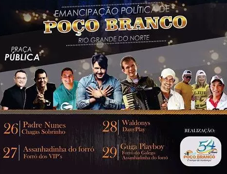 O município de Poço Branco faz aniversário de emancipação política neste final de semana. Para comemorar os 54 anos de criação do município, a prefeitura promoverá uma série de shows para os dias 26, 27, 28 e 29 de julho.