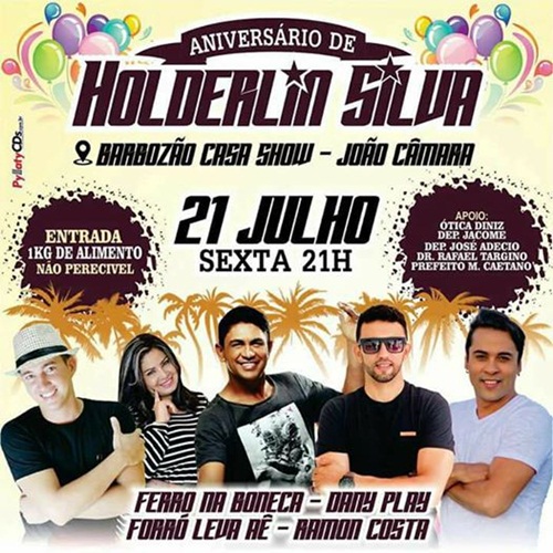 O vice prefeito Holderlin Silva (PODEMOS), irá realizar no próximo dia 21 de julho uma grande festa em comemoração à passagem de seu aniversário. A festa irá acontecer no clube Barbosão Casa Show e irá ser cobrado a entrada de um quilo de alimento não perecível que será revertido as famílias carentes da cidade de João Câmara.