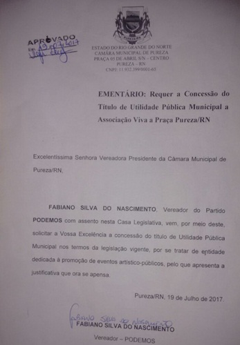 Pureza: Vereador Fabiano Silva, entrega o título de utilidade pública municipal, a Associação viva a praça.
