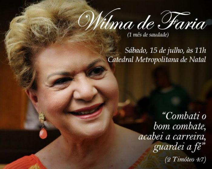 Será no sábado (15), às 11h, na Catedral Metropolitana de Natal, a Missa de 30º dia de falecimento da ex-governadora Wilma de Faria.