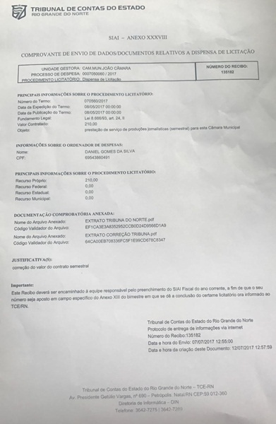No que se refere ao contrato com a Tribuna do Norte o valor é de 210,00 semestralmente o que corresponde a 35,00 mês, gasto este, já informado ao Tribunal de Contas do Estado - TCE e retificado no portal da transparência, esse valor é referente a assinatura do jornal semanal e não para divulgação como foi afirmado pela matéria.