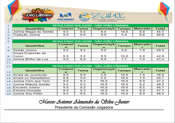 A Secretaria Municipal de Cultura, Turismo e Juventude usou sua página no Facebook para fazer a divulgação do resultado e notas das quadrilhas juninas que se apresentarão nos dia 23, 24, 25 e 26 de junho.