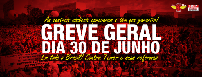Em meio a um cenário onde o presidente Temer apresentou o menor índice de aprovação dos últimos 28 anos (7% dos entrevistados o consideram bom ou ótimo, segundo dados do Datafolha), e onde o mesmo é denunciado pela PGR (Procuradoria Geral da República) por corrupção passiva, obstrução da Justiça e organização criminosa, as centrais sindicais convocam toda a classe trabalhadora para participar ativamente da Greve Geral que ocorre em todo o Brasil nesta 30 de junho. A CSP-Conlutas, central sindical a qual o Sindicato dos Bancários do RN é filiado, defende que somente uma forte Greve Geral pode dar um salto qualitativo na luta para derrotar as reformas Trabalhista e da Previdência, além da Lei da Terceirização irrestrita, bem como botar pra fora Temer e todos os corruptos, virando o jogo de vez a favor dos trabalhadores.