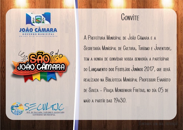 A secretaria de Cultura, Turismo e Juventude realiza na noite de hoje(05) o evento de lançamento da programação das festividades juninas 2017, 0 evento acontecerá na Biblioteca Municipal Professor Evaristo de Souza, situada na praça Monsenhor Freitas a partir das 19h30.