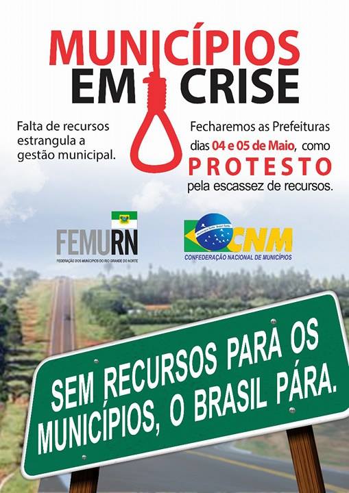 A Federação dos Municípios do Rio Grande do Norte (FEMURN), a Associação dos Municípios do Seridó Oriental (AMSO) e a Federação das Associações de Municípios da Paraíba (FAMUP) mobilizam prefeitos potiguares e paraibanos para a manifestação marcada para essa sexta-feira, 05, às 09 horas, na Praça do Meio do Mundo, a 35 km de Campina Grande, entre a BR 230 e a BR 412.