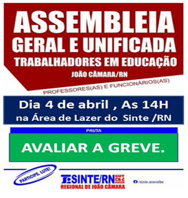 A coordenação do Sindicato dos Trabalhadores em Educação, Sinte RN, regional de João Câmara, está convocando os professores para uma assembleia geral às 14h desta terça-feira(04/04), na área de lazer do Sindicato para uma avaliação da greve.