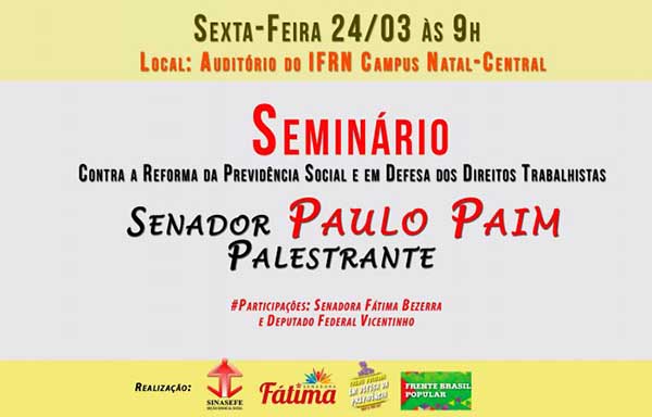 O SINASEFE Seção Natal, o Mandato Popular da senadora Fátima Bezerra, a Frente Potiguar em Defesa da Previdência e a Frente Brasil Popular realizam nesta sexta-feira (24 de março) o Seminário “Contra a Reforma da Previdência Social e em Defesa dos Direitos Trabalhistas”, com o senador Paulo Paim.