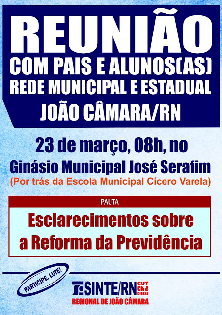 SINTE/RN:Convida Pais e Alunos(as),para uma reunião, nesta quinta(23) as 8hrs,no Ginásio do Cicero Varela, "Assunto: reforma da previdência (PEC-287)"