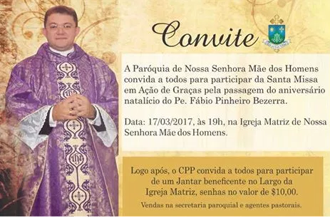 Uma Missa em Ação de Graças será celebrada às 19h desta sexta-feira(17) na Igreja Matriz Nossa Senhora Mãe dos Homens para comemorar a data natalícia do Padre Fábio Pinheiro. Após a celebração haverá um Jantar beneficente.