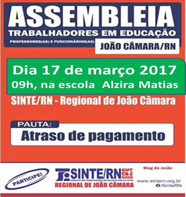 SINTE/RN: Convoca Professores e Funcionários em Educação do município, para assembleia ,Dia 17 de março as 09h, na escola Alzira Matias.