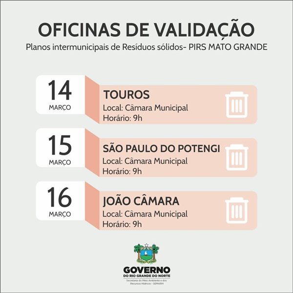 A Secretaria Estadual do Meio Ambiente e dos Recursos Hídricos (Semarh) dará prosseguimento nesta terça-feira(14) as ‘Oficinas’ sobre a elaboração do Plano Intermunicipal de Resíduos Sólidos das regiões de Assú e do Mato Grande. Os eventos tiveram início na quarta-feira (08) e prossegue até quinta-feira(16) nos municípios de Touros(14), São Paulo do Potengi(15) e João Câmara(16).