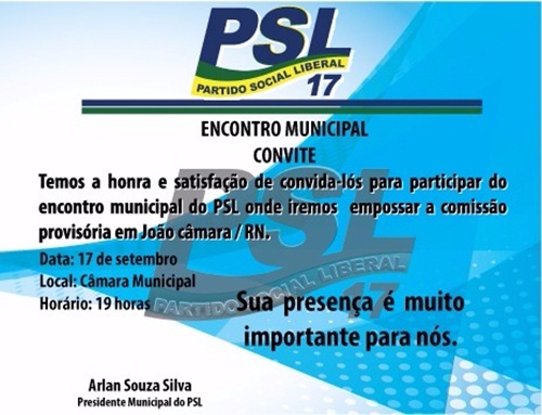 O Partido Social Liberal(PSL) realizará na próxima quinta-feira(17) um encontro municipal para empossar a nova comissão provisória no município de João Câmara.