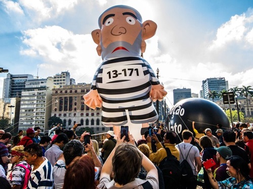 Um boneco inflável gigante do ex-presidente Luiz Inácio Lula da Silva com roupa de presidiário foi montado na tarde desta sexta-feira na frente da Prefeitura de São Paulo, no Viaduto do Chá, na região central de São Paulo. Pela manhã, o boneco foi montado na Ponte Octávio Frias de Oliveira, a Ponte Estaiada, na Zona Sul.