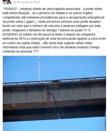 Este mesmo boato que circulou na Internet de que a ponte de Igapó estava com uma rachadura e poderia desabar ocorreu também como uma ponte em Caicó num passado recente. A rachadura é na Ponte Rio de Janeiro/ Niterói. Que é necessária, de acordo com os administradores.