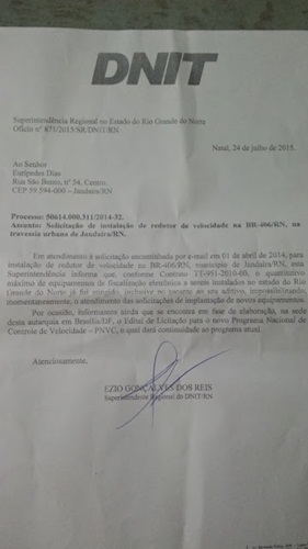 O DNIT órgão federal responsável pela BR 406 que conta a cidade de Jandaíra, enterrou as esperanças da população em ter lombadas eletrônicas para controlar a velocidade dos carros que entram na cidade.