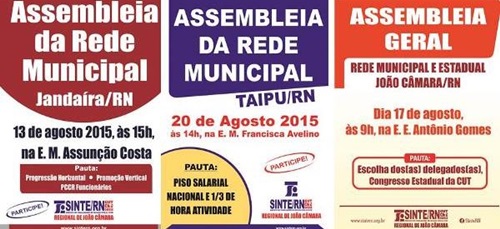 O Sindicato dos Trabalhadores em Educação do Rio Grande do Norte, Sinte-RN Regional de João Câmara realizará Assembleias com a categoria nos municípios de João Câmara Taipu e Jandaíra nos próximos dias 13, 17 e 20 de agosto No dia 13 será em Jandaíra às 15h na Escola Municipal Assunção Costa tendo como pauta a Progressão Horizontal, Promoção Vertical e PCCR dos funcionários No dia 17, haverá Assembleia em João Câmara com trabalhadores da Educação do Estado e Município para escolha dos delegados ao Congresso Estadual da CUT e no dia 20 haverá assembleia em Taipu na Escola Municipal Francisca Avelino para tratar do piso nacional salarial e 1/3 da hora atividade.