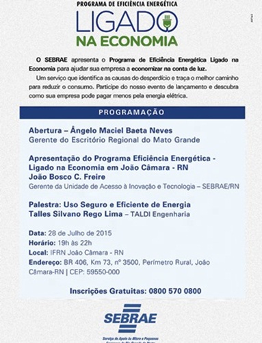 Nesta terça-feira(28) o SEBRAE em parceria com o IFRN fará a apresentação do Programa de Eficiência Energética Ligado na Economia par ajudar sua empresa a economizar na conta de luz. O evento irá acontecer às 19h no auditório do IFRN – Campus João Câmara.