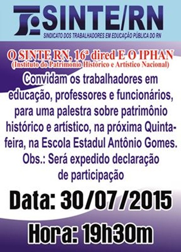 O Sinte-RN, regional de João Câmara, a 16ª Diretoria Regional de Educação e o Instituto do Patrimônio Histórico e Artístico Nacional, farão uma palestra sobre Patrimônio Histórico e Artístico nesta quinta-feira(30) na Escola Estadual Antônio Gomes.