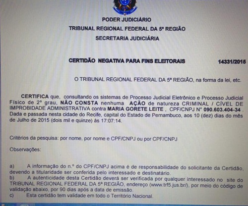 “Eleição de 2016 se aproxima, para quem é de João Câmara/RN ai esta uma resposta para quem está apostando que Gorete Leite não pode ser candidata, Certidão Negativa da 5 Região emitida hoje (10/07/15) atesta que contra a ex-prefeita não existe nenhum processo de improbidade administrativa, portanto vão se preparando que ano que vem a Nação Goreteira e seus candidatos a vereador vão está nas ruas, não deixe os comentários maldosos lhe influenciar e decida por quem você acha melhor”.