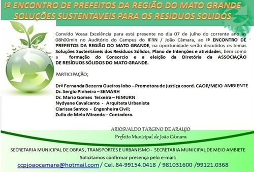 Nesta terça – feira (7 Jul 2015) será realizado no auditório do Campos do IFRN de João Câmara/RN, o I Encontro de Prefeitos da Região do Mato Grande onde serão discutidos os temas Soluções sustentáveis dos resíduos sólidos, plano de Intensões e atividades, bem como a formação do consórcio e a eleição da diretoria da Associação de resíduos Sólidos do Mato Grande.