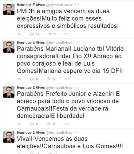 O ministro do Turismo, Henrique Alves, comemorou no Twitter o pé-quente deste domingo (04), quando o PMDB elegeu Mariana Fernandes, em Luís Gomes, e o aliado Junior Benevides (PSB), em Carnaubais.