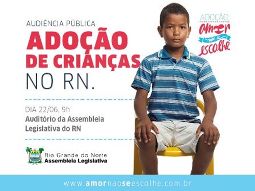 Por proposição do deputado Ezequiel Ferreira (PMDB), a Assembleia Legislativa realiza em seu auditório, na próxima segunda-feira (22), a partir das 9h, a audiência pública sobre “Adoção de Crianças No Rio Grande do Norte”. Na audiência será lançada a campanha publicitária do Legislativo “Adoção: Amor Não Se Escolhe”.
