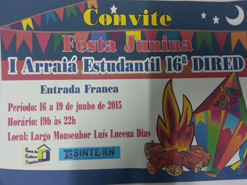 Nos dias 16 a 19 de Junho a 16ª DIRED em parceria com a casa da cultura popular está organizando o I Arraiá Estudantil que terá a participação de estudantes de toda a região do mato grande.