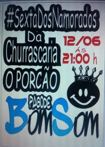 Hoje a partir das 21h a churrascaria porcão realiza um grande evento em comemoração ao dia dos namorados, musica ao vivo com os meninos do pagode bom som.