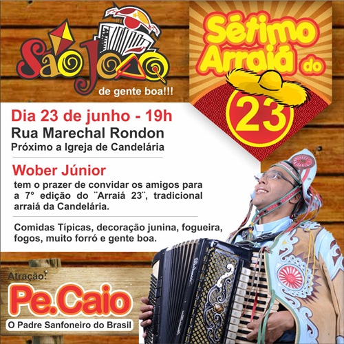 O partido popular socialisata-PPS, do ex- deputado wober junior está promovendo o tradicional são joão de gente boa, que acontecerá na rua marechal rondon- candelária/Natal- com muitas comidas tipicas e a apresentação do padre caio, o padre sanfoneiro do brasil.