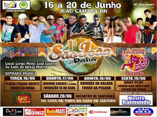 A Casa da Cultura Popular Gumercindo Saraiva, em João Câmara e a 16ª DIRED, promoverão o 1º São João do Povo no período de 16 a 20 de junho, no largo da praça Monsenhor Luiz Lucena, em frente à Casa da Cultura.